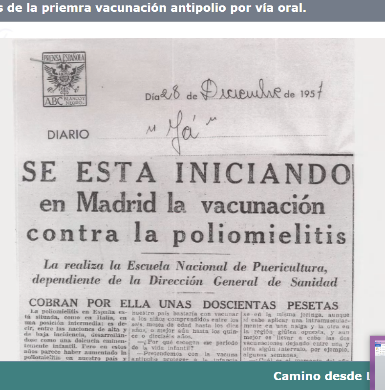 “La vacunación masiva y gratis llegó a España en 1964, una década después de que Jonas Salk inventara la vacuna en EEUU. Miles de bebés se contagiaron sin remedio, -como yo mismo-, o como Lola Corrales, presidenta de la Asociación de Afectados de Polio y Síndrome Postpolio, que contactó con el virus con 13 meses, al igual que un servidor. Su asociación denunció al Estado en 2005 por negligencia, pero el juez, sin abrir diligencias, acabó archivando el caso por falta de identificación de los posibles culpables”. Ver diario Público ya en 2009 aquí: