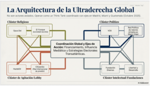 • Entramado de Ultraderecha: Se identifica un «Think Tank» de organizaciones que incluyen al Opus Dei, Vox, HazteOír, CitizenGo, la sociedad secreta El Yunque, y fundaciones como Disenso o Libertad y Desarrollo.