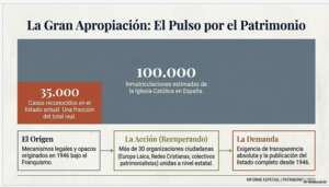 Uno de los puntos de mayor fricción identificados es el proceso de inmatriculación de bienes por parte de la Iglesia Católica. A través de la coordinadora estatal “Recuperando” , en la que participan organizaciones como Europa Laica y Redes Cristianas, se impulsa una campaña de transparencia.