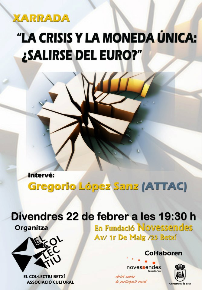 “Hay quienes dicen que una salida del euro de España en el contexto de la actual crisis sería un desastre. Sin embargo, los/as que así se manifiestan no suelen calificar de desastre lo que YA está aconteciendo como consecuencia de seguir aferrados a toda costa al euro y a sus reglas: las nulas esperanzas de millones de trabajadores/as de encontrar un empleo, la quiebra generalizada de administraciones públicas y los servicios que hasta ahora venían prestando, el miedo creciente de la gente a su futuro inmediato, el poder absoluto de los magnates de las finanzas gracias a la connivencia de políticos cómplices, el aumento de la represión policial para frenar las ansias de ciudadanía de la gente indignada, el pisoteo de derechos sociales porque la estabilidad presupuestaria se impone a las personas,…”